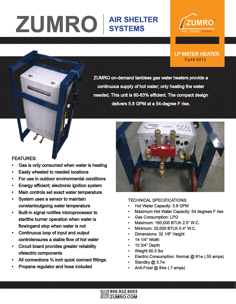 ZUMRO offers a complete line of DECON Accessories to help you complete your mission. ZUMRO offers a full line of water heating and handling accessories, including water heaters, sump pumps, soap injectors, manifold kits and beyond. ZUMRO can also prepare you for all of your patient handling needs. Our custom built roller tables and wheelchairs lightweight and corrosion resistant. They are ideal for emergency use. Made 100% in the USA.